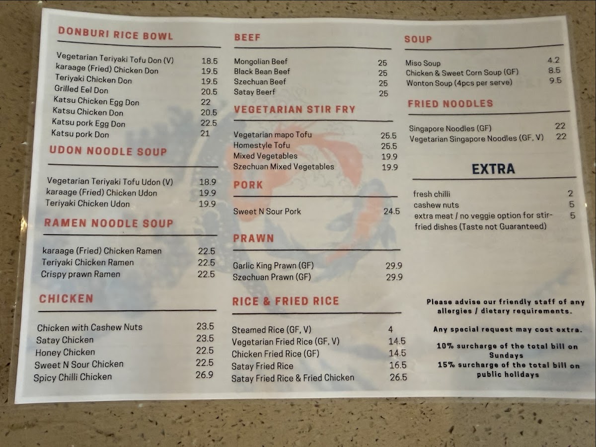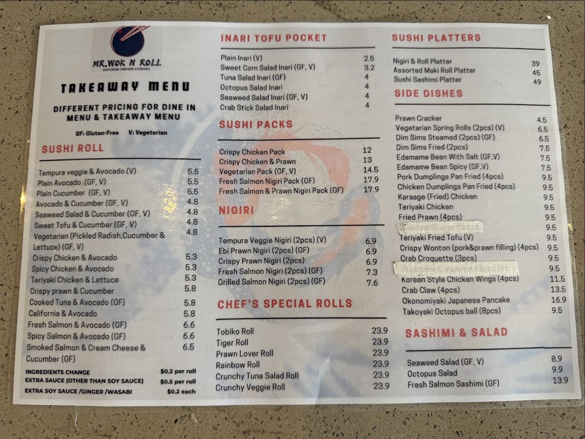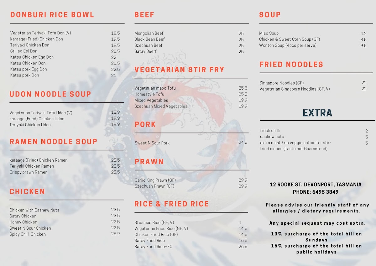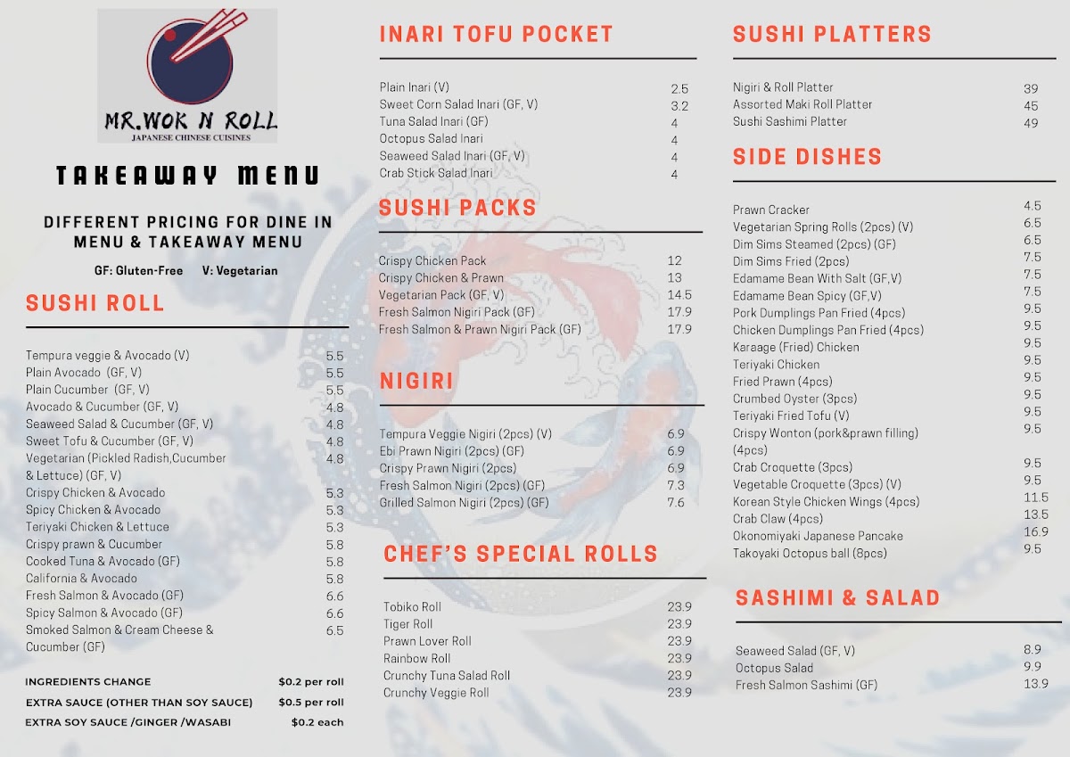 The menu at Mr. Wok N Roll on 12 Rooke St, Devonport offers a vibrant mix of Asian flavors that cater to a wide range of tastes. From the hearty Donburi Rice Bowls like Vegetarian Teriyaki Tofu Don, Karaage (Fried) Chicken Don, and Grilled Eel Don, to the rich Beef selections such as Mongolian Beef, Black Bean Beef, and Szechuan Beef, the options are both diverse and satisfying. Soup lovers can enjoy Miso Soup, Chicken & Sweet Corn Soup, or Wonton Soup, while noodle enthusiasts have choices like Singapore Noodles, Vegetarian Singapore Noodles, and Udon Noodle Soups including Teriyaki Chicken Udon. Vegetarians are well-catered for with dishes like Vegetarian Mapo Tofu, Homestyle Tofu, and Szechuan Mixed Vegetables. The Ramen Noodle Soup range, featuring Karaage Chicken Ramen, Teriyaki Chicken Ramen, and Crispy Prawn Ramen, pairs well with fried rice options such as Vegetarian Fried Rice, Chicken Fried Rice, and Satay Fried Rice. Chicken and prawn dishes like Honey Chicken, Spicy Chilli Chicken, Garlic King Prawn, and Szechuan Prawn deliver bold flavors, while Sweet & Sour Pork satisfies those craving classic comfort food. For lighter bites, the sushi section impresses with Nigiri & Roll Platter, Assorted Maki Roll Platter, and Sushi Sashimi Platter, alongside packs like Crispy Chicken Pack and Fresh Salmon & Prawn Nigiri Pack. Creative rolls such as the Tiger Roll, Prawn Lover Roll, and Crunchy Tuna Salad Roll highlight the chef’s flair, complemented by sides like Vegetarian Spring Rolls, Dim Sims Steamed or Fried, and Edamame Bean With Salt. Overall, the menu balances traditional favorites with inventive options, ensuring there’s something for everyone, whether you’re after hearty mains, fresh sushi, or light, flavorful sides.